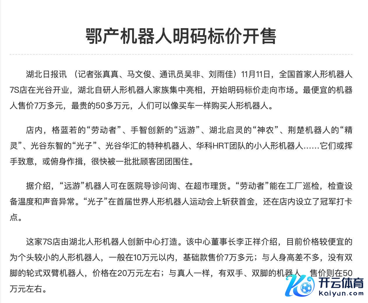 凤凰网科技讯 11月12日,据湖北日报音讯,寰宇首家东谈主形机器东谈主7S店昨日在光谷开业,最低廉的机器东谈主售价7万多元,最贵的50多万元体育游戏app平台,东谈主们不错像买车雷同购买东谈主形机器东谈主。
