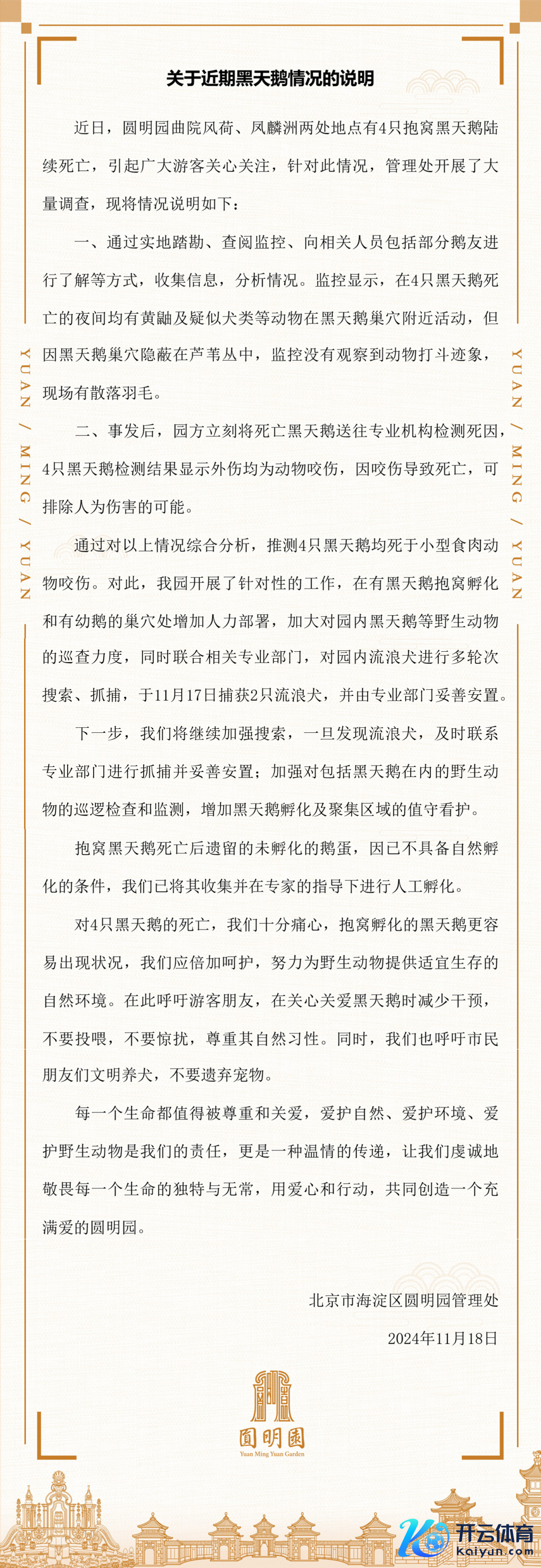 近日,圆明园曲院风荷、凤麟洲两处所在有4只抱窝黑天鹅络续示寂,引起巨大旅客温顺关注。