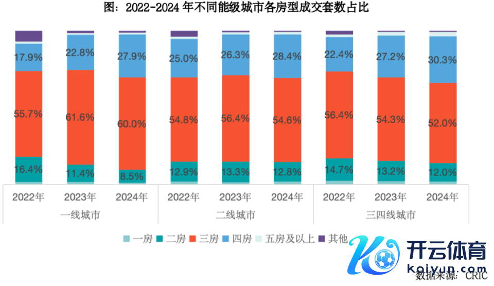 2024年,凭证CRIC重心监测的193个城市数据自大,三房居品成交套数占比54%,较客岁下落1.9个百分点;四房居品的市场份额则逐年增长,本年景交套数占比较客岁升迁2.8个百分点至29.2%。此外,五房及以上房型的居品成交比重也略有增多,上涨了0.2个百分点。