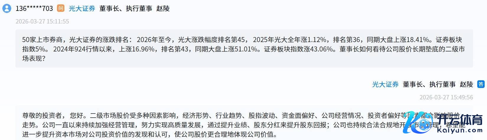 值得一提的是,在3月27日下昼召开的事迹阐明会上,多位投资者就光大证券股价推崇及估值水平发问,更有投资者直言“董事长如何看待公司股价弥远垫底的二级商场推崇?”