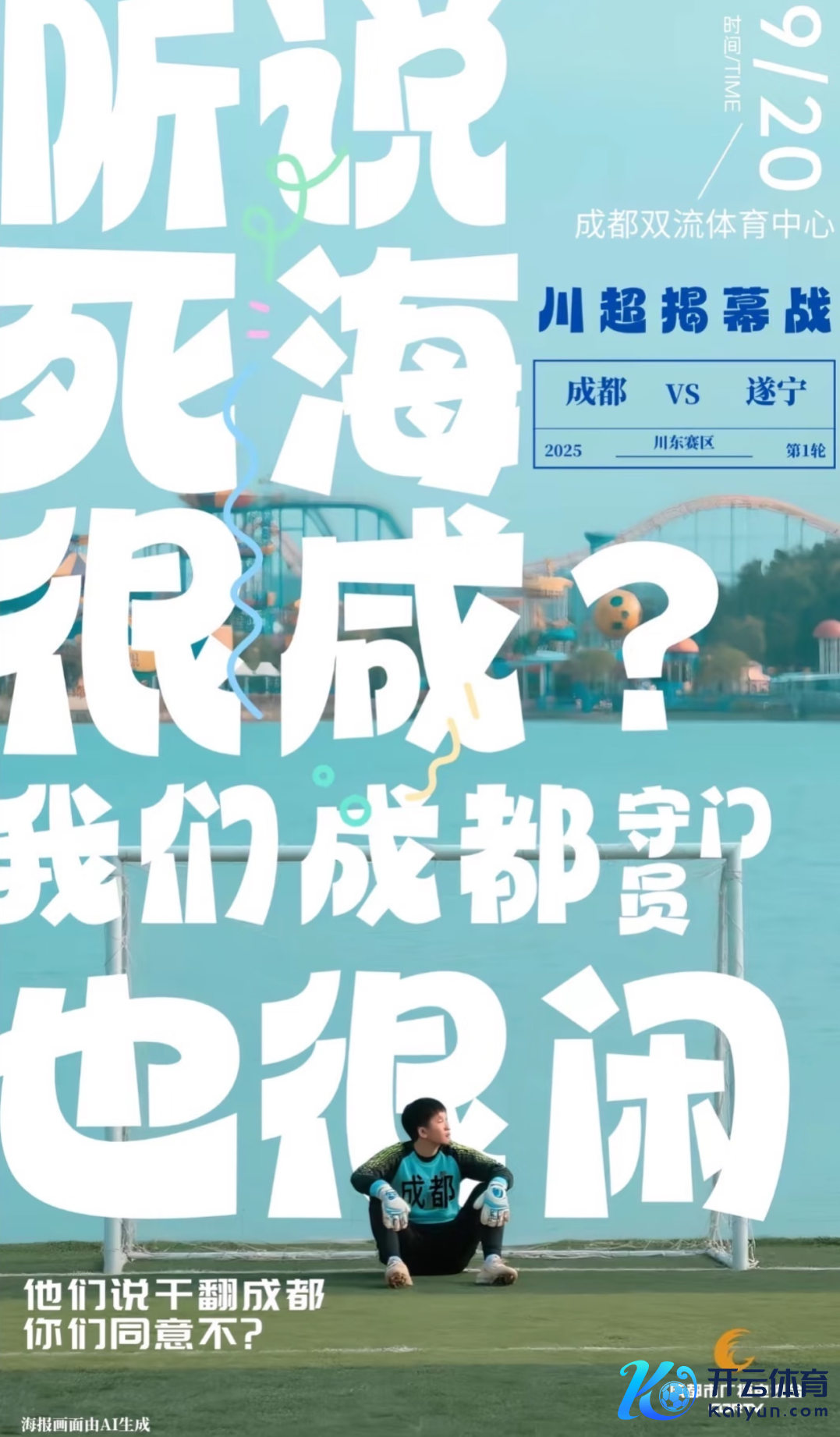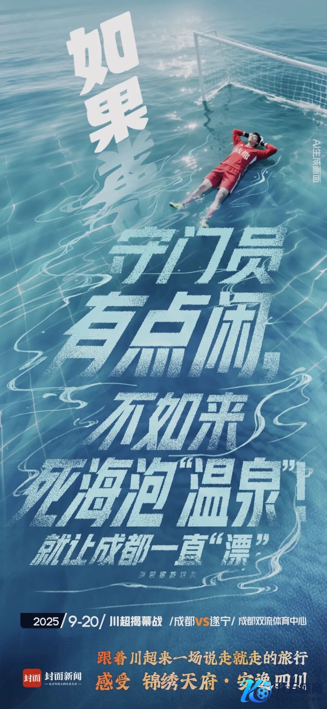 戎马未动,氛围先行。这两天,一张写有“传闻死海很咸,咱们成都守门员也很闲”的海报驱动喊话遂宁。海报中央是一派蓝色湖面,岸边草地上立着球门,身着“成都”球服的守门员,知足地坐在地上,远看远处出神。
